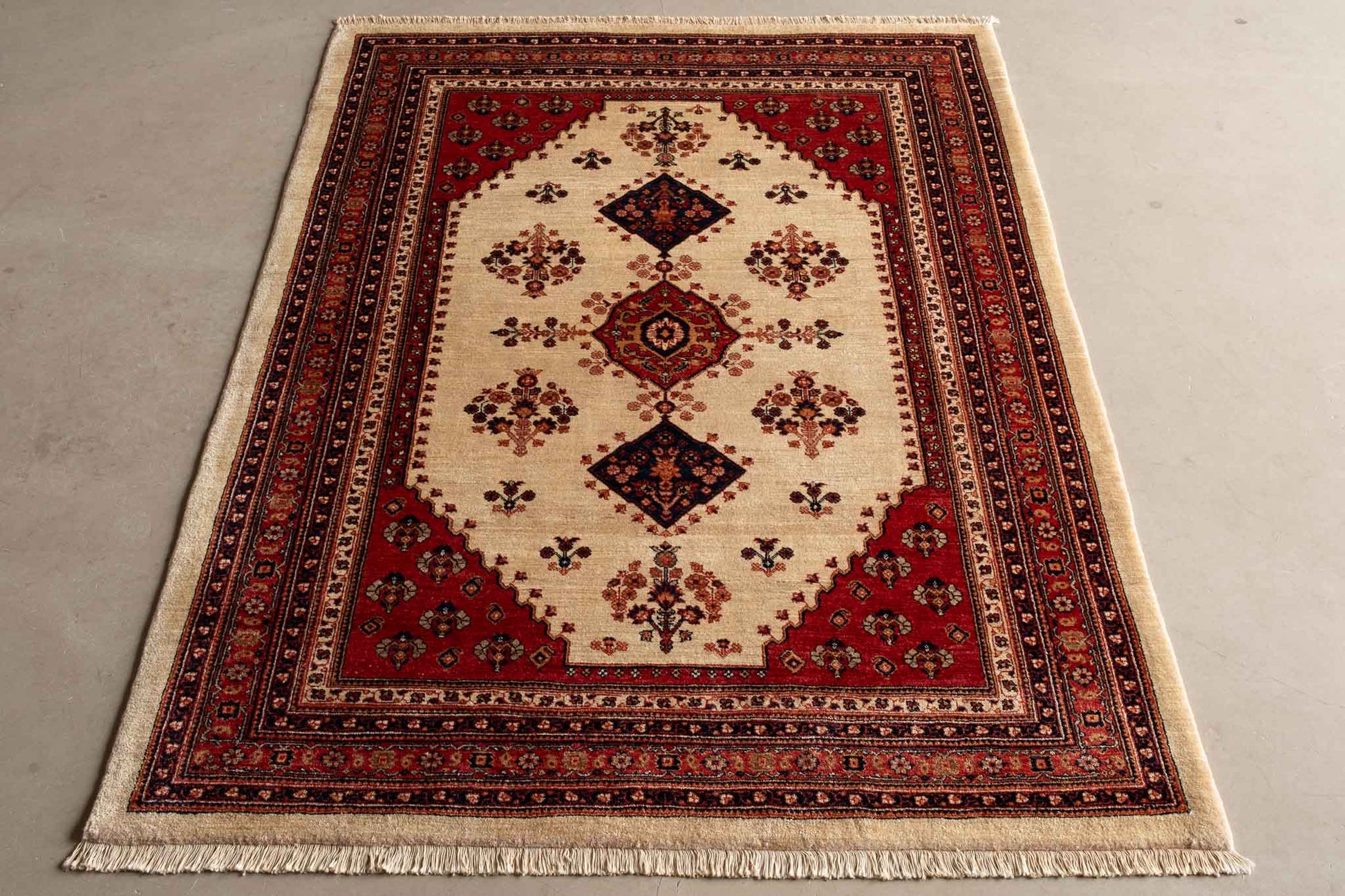 - Flor: Handgesponnene, pflanzlich gefärbte Schurwolle